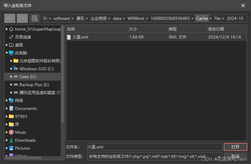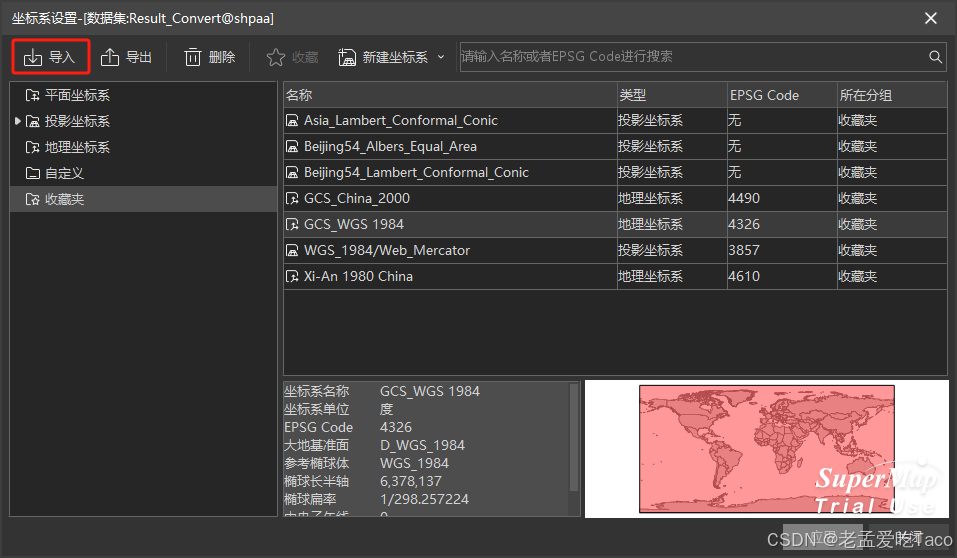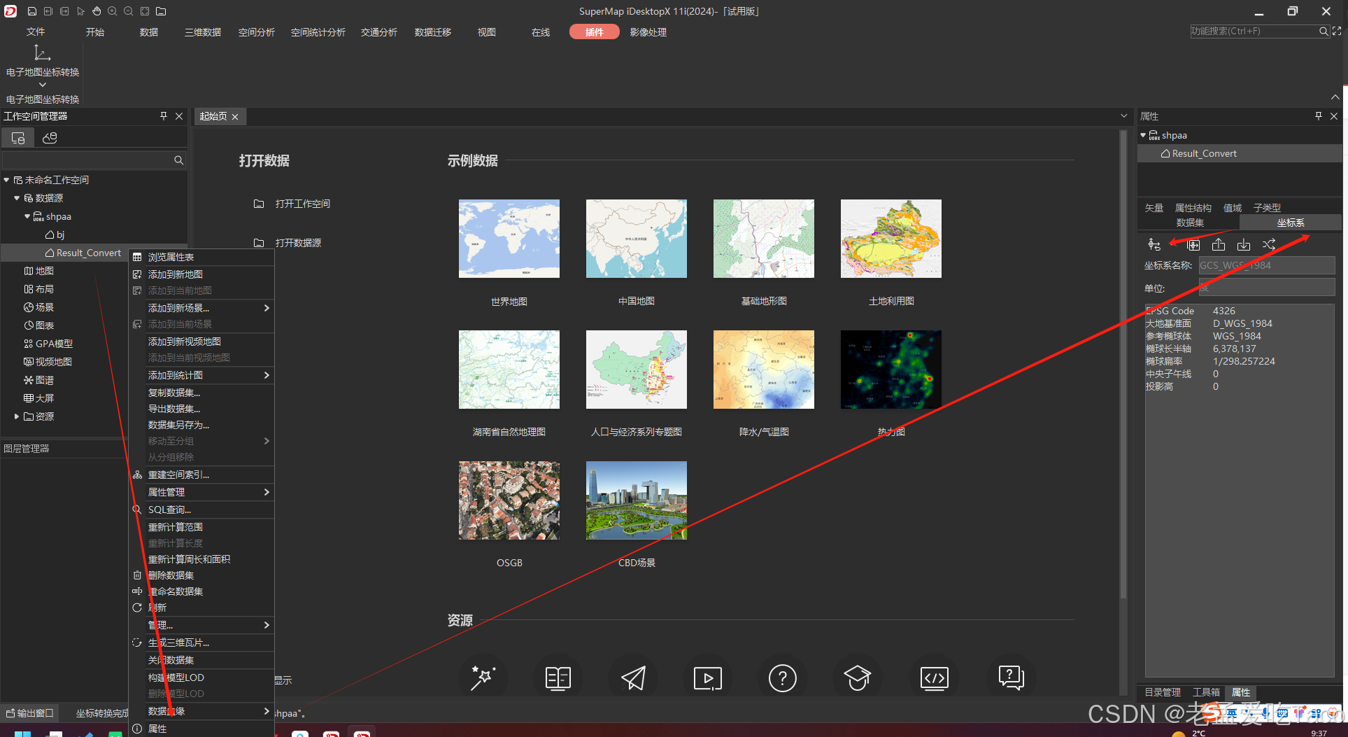 右键数据集选择【属性】,在【坐标系】中选择【重设坐标系】。导入提供的火星坐标系xml(https://download.youkuaiyun.com/download/weixin_42532695/90114342)文件,并应用到该数据即完成数据的火星坐标系转换。