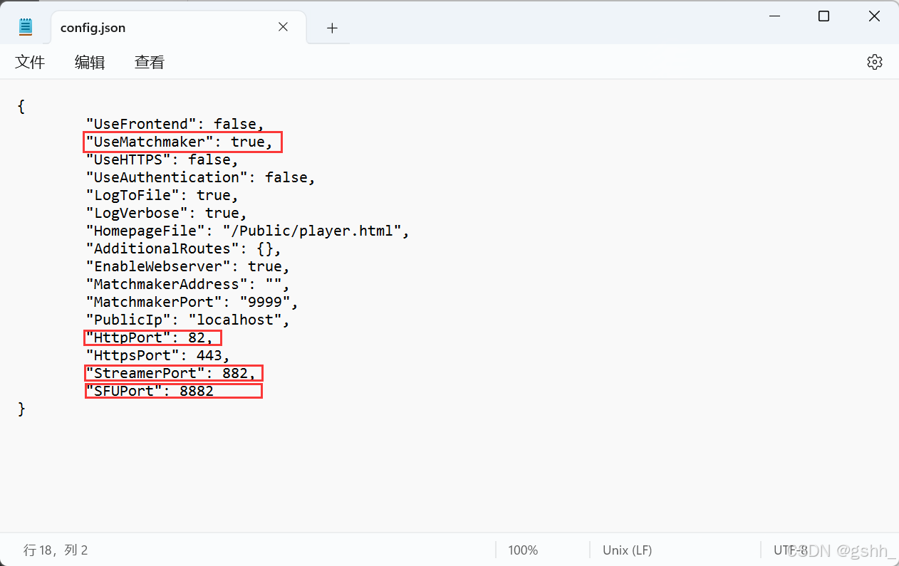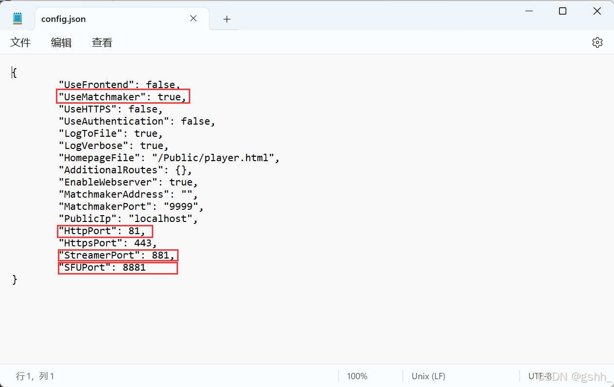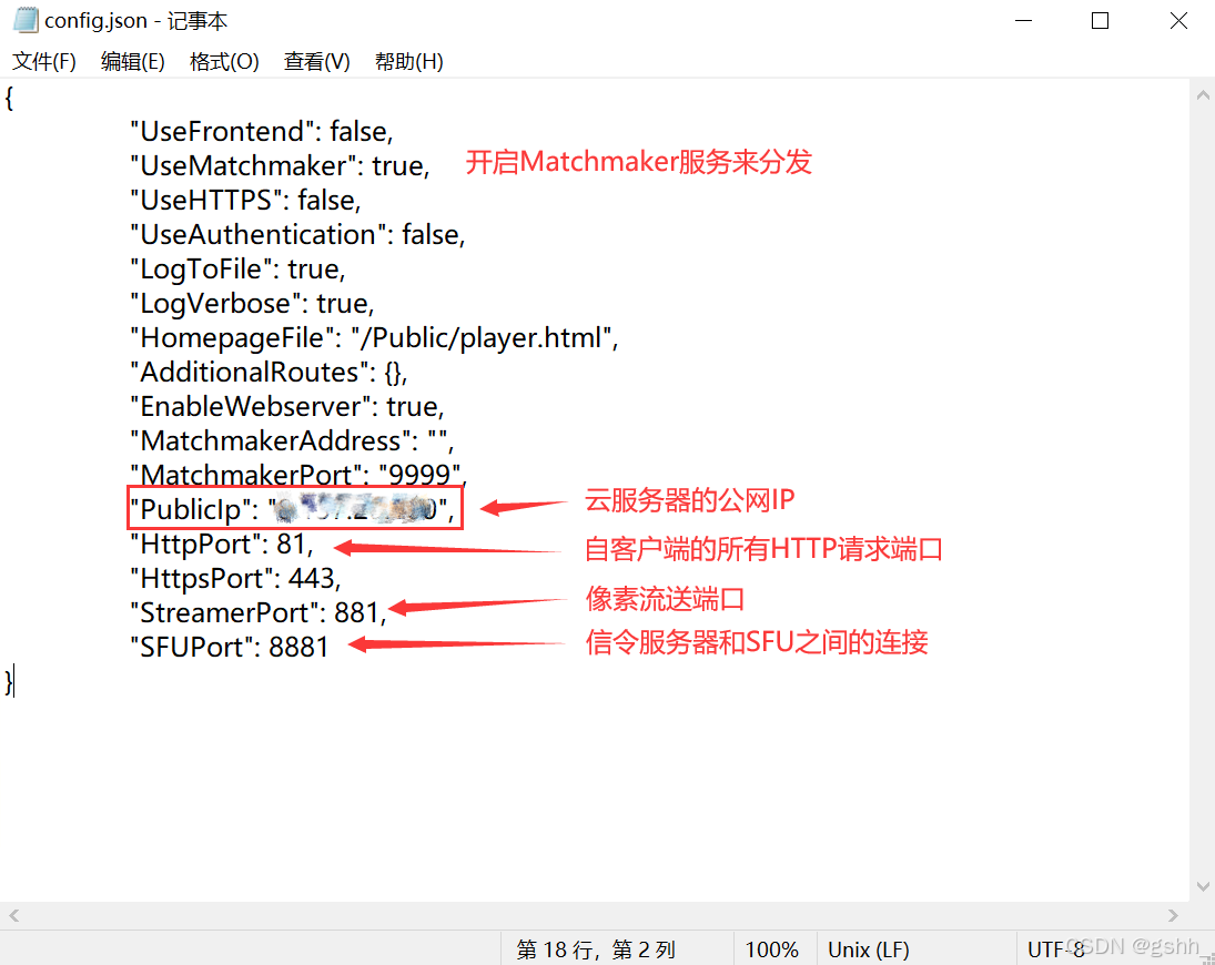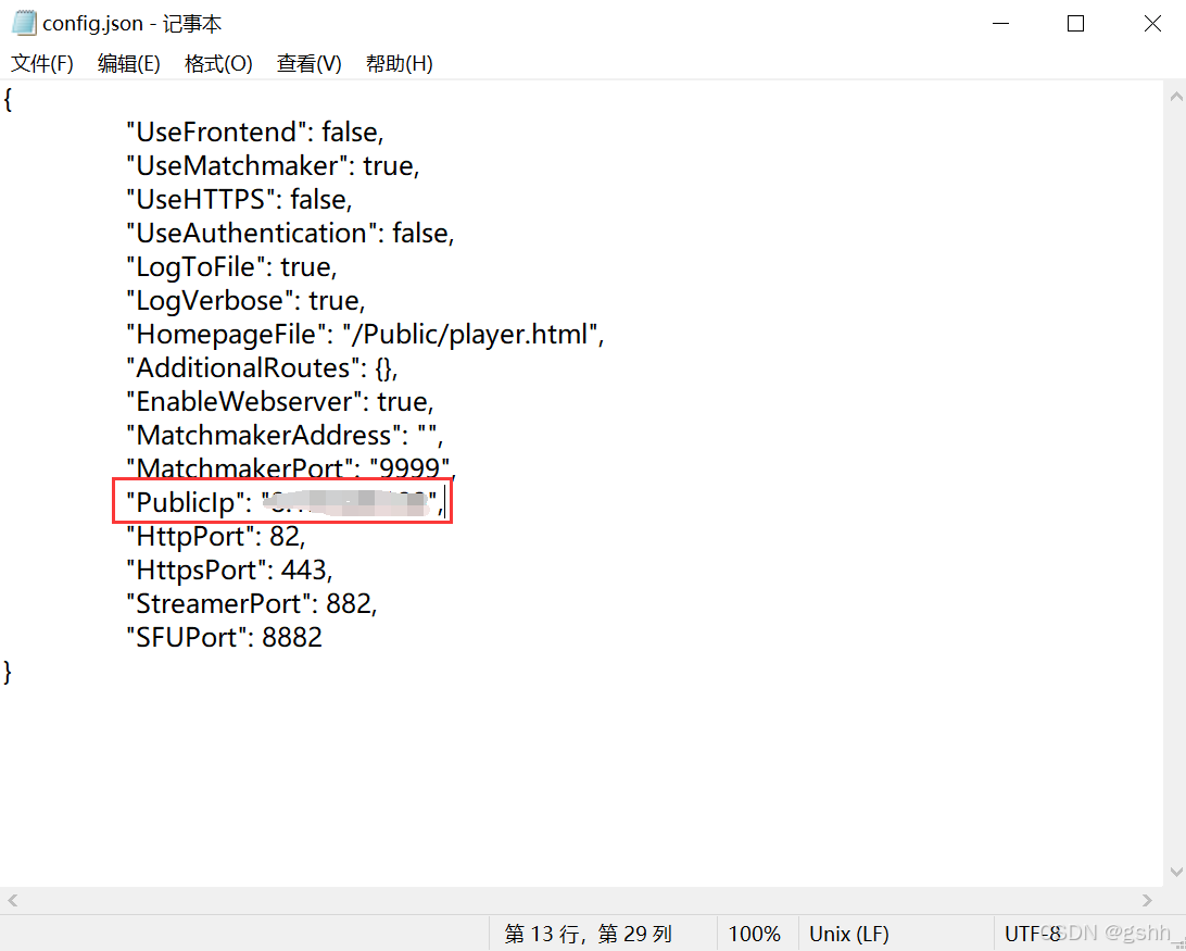 打开上传文件夹“\PixelStreaming\WebServers\SignallingWebServer”下的“config.json”文件,修改“PublicIp”参数为云服务器的公网IP,检查其他端口是否开放。另一个“SignallingWebServer -副本”下的“config.json”也做相应调整。