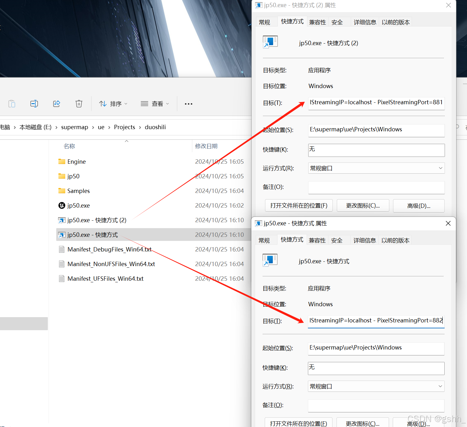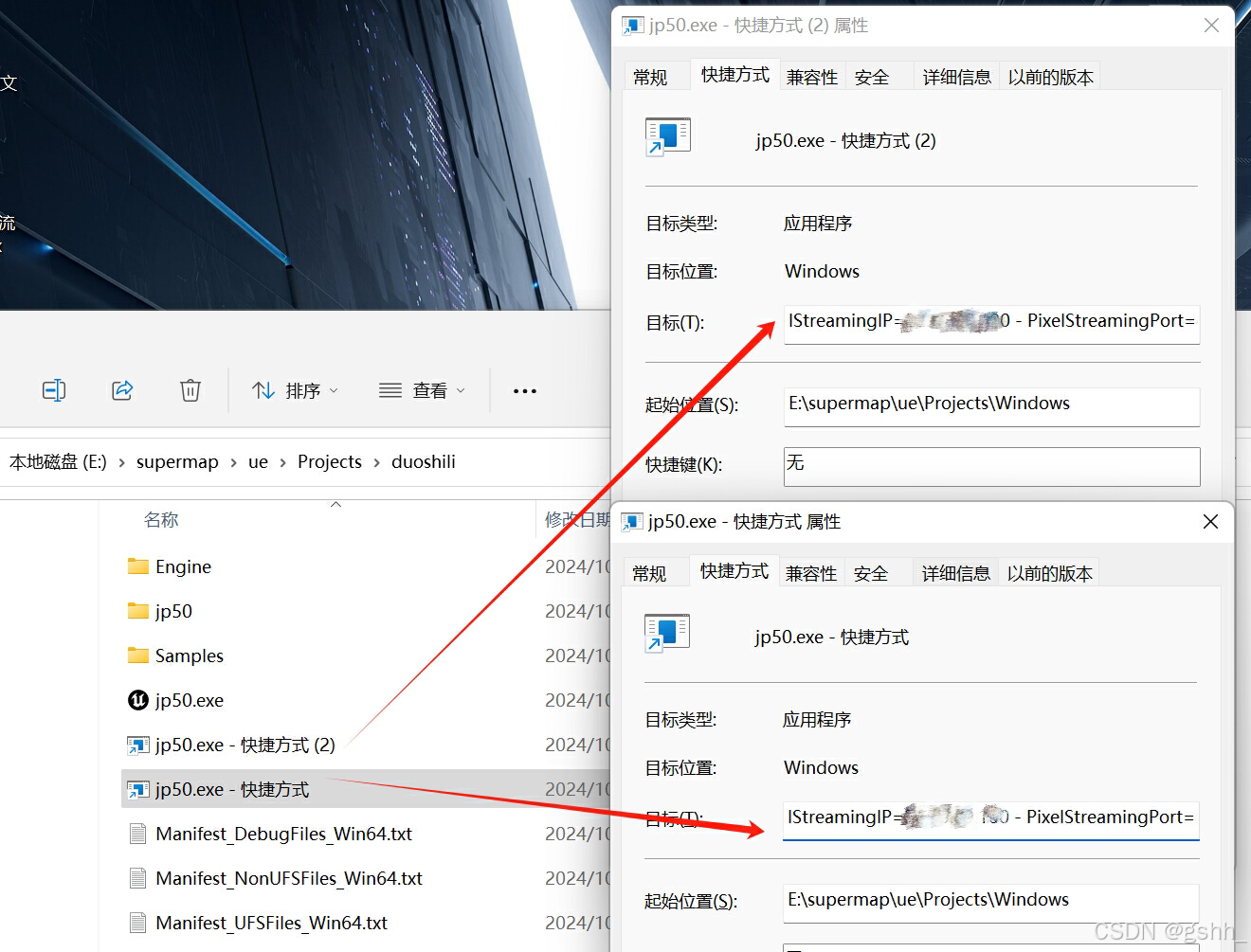 找到打包文件,按住 Alt+exe 文件拖拽再生成一个快捷方式,右击快捷方式,选中属性,在“目标”后面添加启动参数(注:像素流端口更改,不被其他占用即可)。