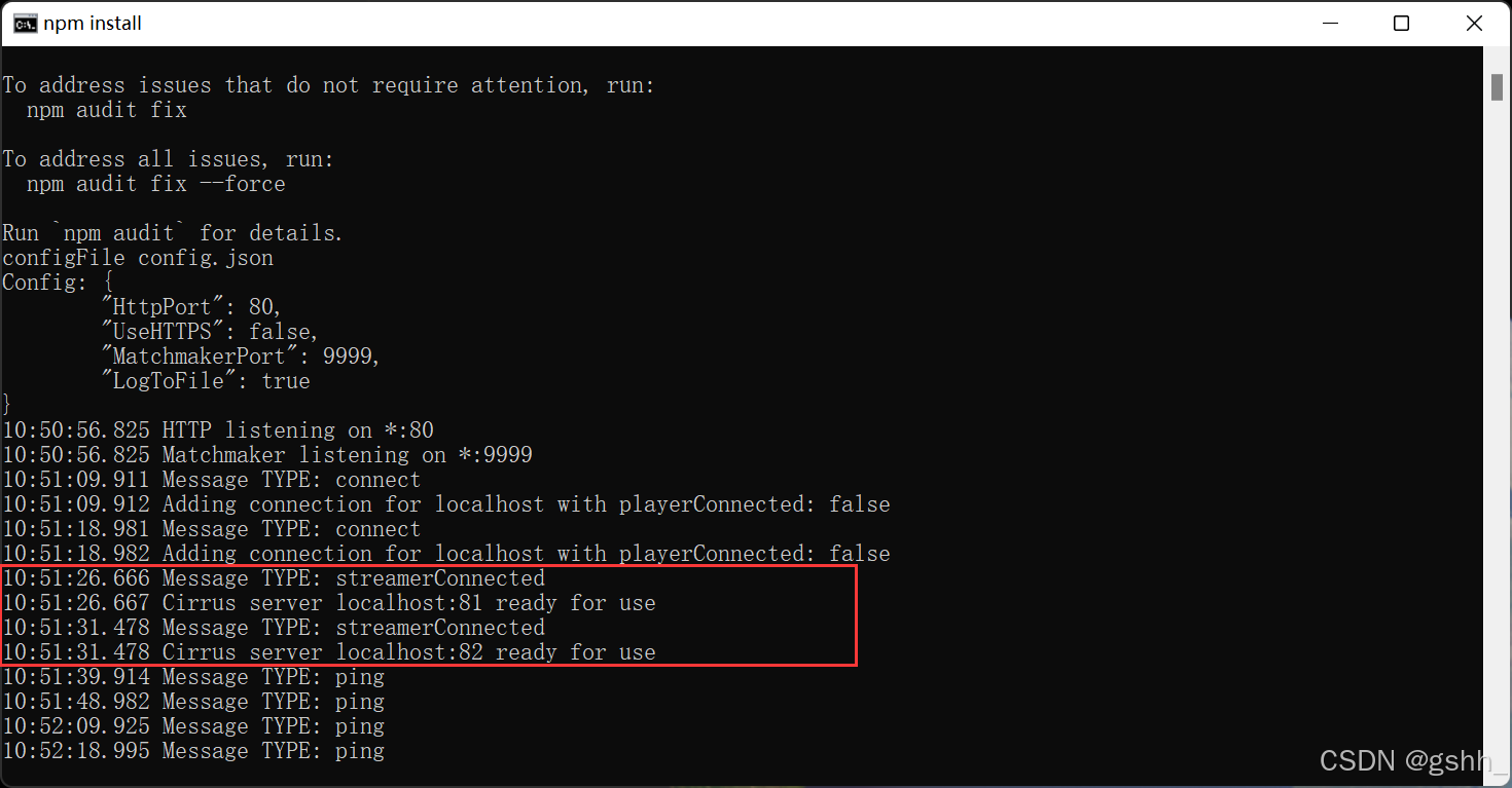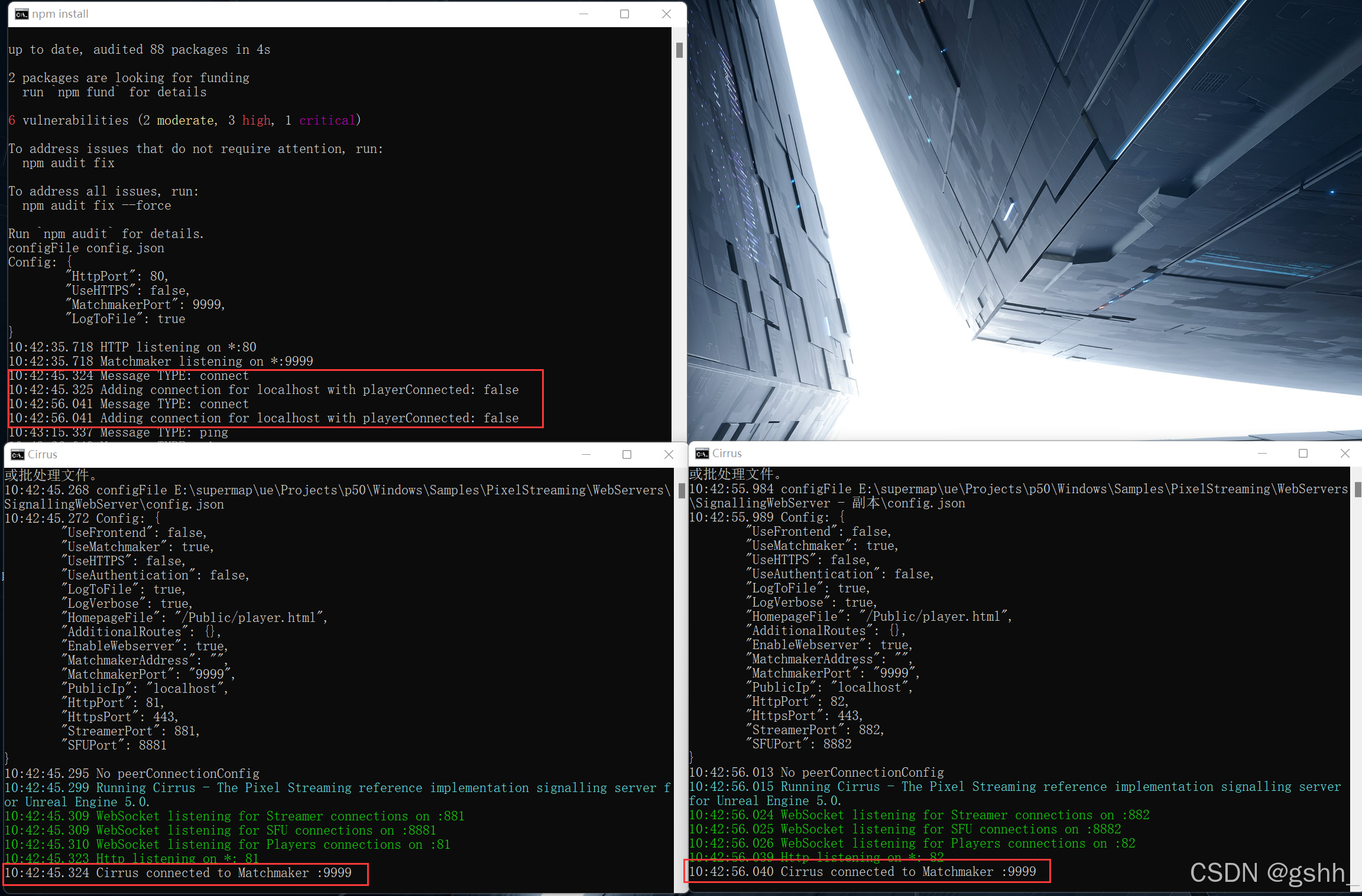 信令服务器启动成功后,两个实例的信令服务器会显示连接到了Matchmaker:Cirrus connected to Matchmaker :9999;运行的Matchmaker服务也会显示连接到了信令服务器:Message TYPE: connect。