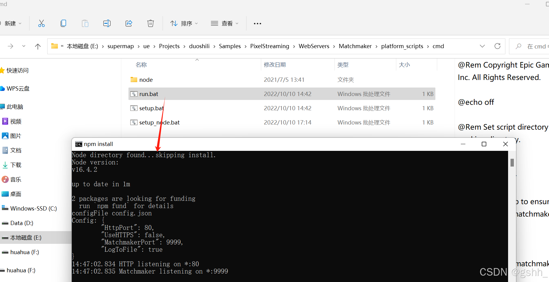 全部配置好之后,我们运行Matchmaker,找到\PixelStreaming\WebServers\Matchmaker\platform_scripts\cmd中的run.bat,双击运行,如果是初次运行会自动安装必要环境,不放心也可以先运行setup.bat再run.bat。