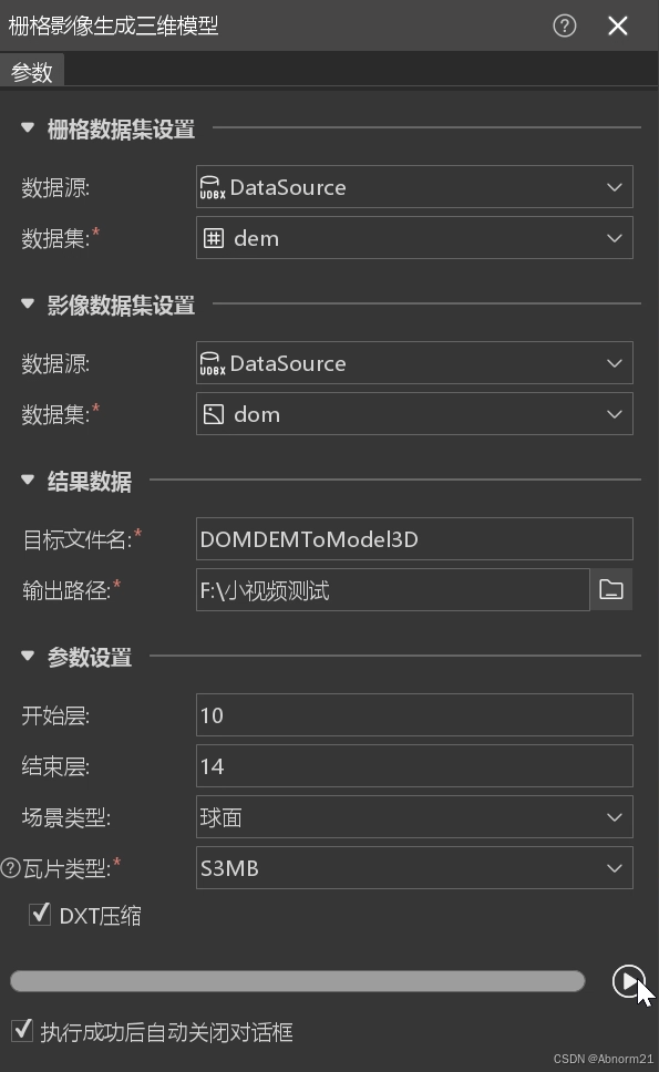 4、设置结果数据的文件名和保存路径,点击运行按钮,即可执行栅格影像生成三维模型缓存的操作,快去试试吧!