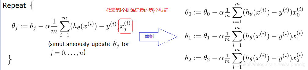 在线性回归中,常用到多项式也就是多变量的情况,比如,一个公式 y = a1 * x1 + a2 * x2 + ...... + b 。其中 y 和 各个x都是基于时间的已知数据,每一组x都有对应的y。各个a和b是未知的,而线性回归的流程就是先给出任意a和b的值,然后把每一组x代入公式,这样就能够求出yy ,最后需要对比 yy 和 y的偏差,追求yy和y的偏差小。每变换一组a和b的值就可以算出新的yy,然后再和y对比偏差,如此穷举循环,找出于实际y偏差最小的那个yy,此时对应的这组a和b的值就是最终结果,成为最终的完整公式,用于根据新的x来计算 y,也就相当于做预测。上述的流程就是穷举求极限的过程(极限小), Cost Function 选用最小二乘,那就是穷举得出 yy和y的最小二乘的极限小值,这个求极限就可以转变成 偏导数的问题了,这样最小二乘中的 平方 就变成一阶了 。最后就是上面提到blog里面的梯度下降公式了: