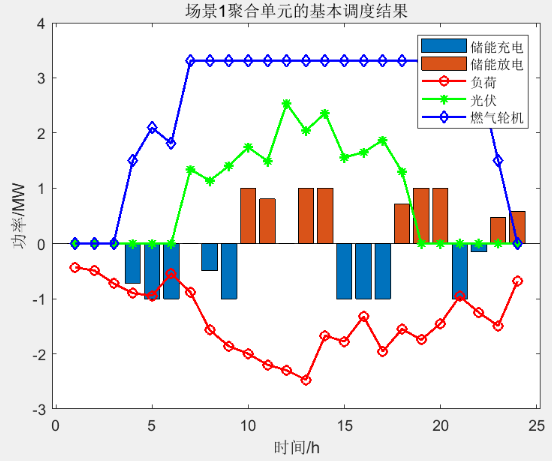 %模型中,考虑了燃气轮机、储能,光伏,负荷四种单元,并考虑可以并网