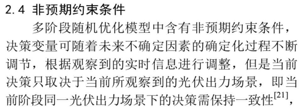 非预期约束是如何处理随机优化问题的呢?国内一些文献也是采用该类方法,如下所示,非预期约束也就是为了限定在风电、光伏以及其他因素存在的情况下,有且只有一种状态是被用在日前调度模型里的。
