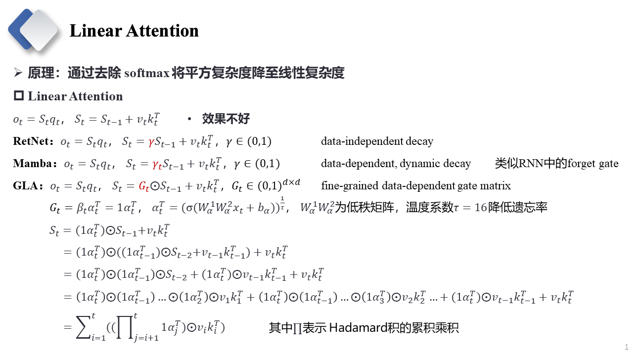上一章《Linear Attention续集》简单介绍Linear Attention训练中的Memory-efficient和Hardware-efficient方法,这章主要介绍Gated Linear Attention(GLA)的原理。(本文仅供学习参考,禁止商用盗用,转载请注明出处)