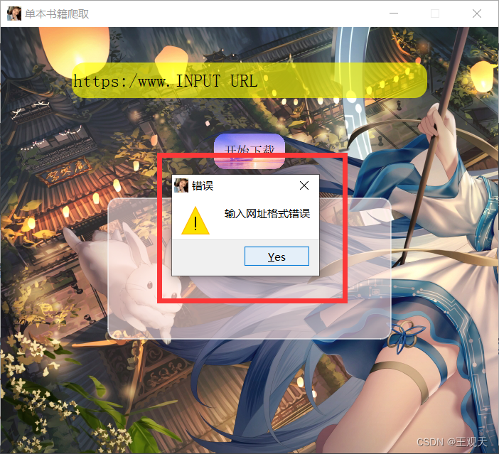 QMessageBox.warning(self, '错误', "输入网址格式错误", QMessageBox.Yes, QMessageBox.Yes)