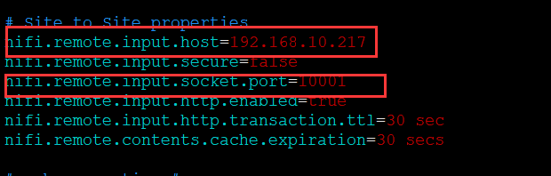 修改块为:”Site to Site” ,主要设置远程调用的ip和端口:具体如下:nifi.remote.input.host=192.168.10.217; nifi.remote.input.socket.port=10001