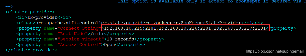 在解压的nifi目录下,找到conf目录,修改state-management.xml文件中stateManagement 根节点下的cluster-provider节点内容,将id为zk-provider的节点的property的设置中name=”Connect String”修改为zk的连接属性:如下设置: