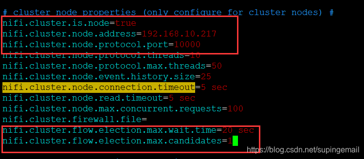 端口,最大等待时间和候选配置:具体修改为: nifi.cluster.is.node=true;nifi.cluster.node.address=192.168.10.217