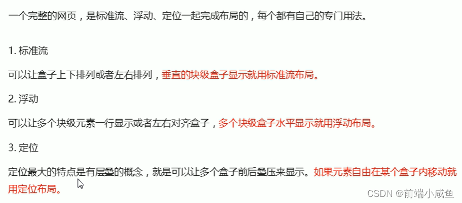 浮动元素不同,只会压住他下面标准流的盒子但不会压住下面标准流盒子里面的文字。但是绝对定位(固定定位)会压住下面标准流所有的内容。浮动最初就是为了使文字环绕