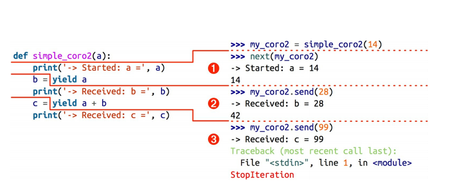send操作一定要调用next方法预激, 使其停留在第一个yield位置def simple_coro(a): print("初始值 a=", a) b = yield a print("传递值 b=", b) c = yield a + b print("传递值 c=", c) coro = simple_coro(1) print(next(coro)) print(coro.send(2)) print(coro.send(3))