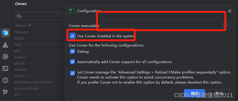 把刚刚安装的conan.exe路径配置一下(如:D:\Program Files\python3\Scripts\conan.exe或者勾选"Use Conan installed in the system")