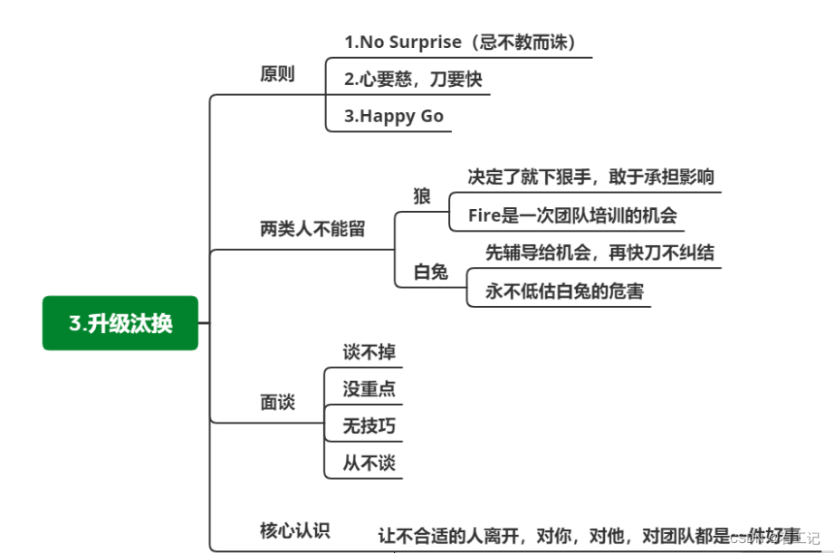 Happy stay、Happy go: 很多时候,送走一个同学对彼此来说并不是一件糟糕的事,换个角度看,如果他在当前环境下一直无法适配团队,对他来说也是很难受的,这时分开对他对团队都是解脱。尤其是当公司出现变化时,如果一些同学不再合适,换环境来讲对他是新的机会,所以你不要存在太多的情绪,而是要往“好聚好散”的方向上推动。