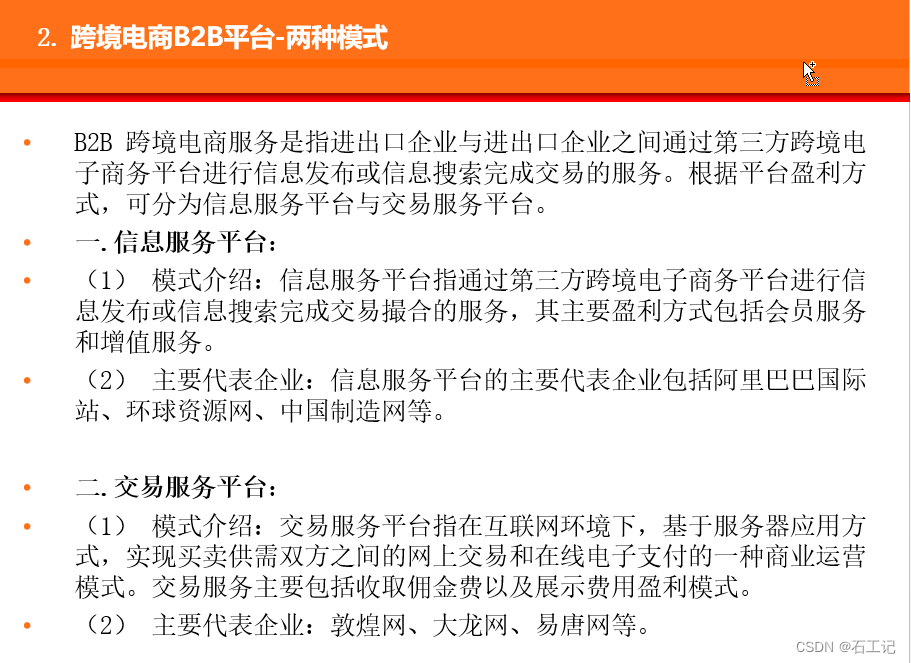 •B2B 跨境电商服务是指进出口企业与进出口企业之间通过第三方跨境电子商务平台进行信息发布或信息搜索完成交易的服务。根据平台盈利方式,可分为信息服务平台与交易服务平台。