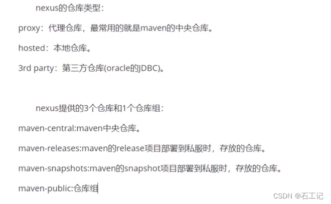 【托管资源库】:就是放在本地的资源库,零零散散的jar,从远程仓库中下不到,只能自己在网上找,找到jar下载下来,放在托管资源库中,交给nexus统一管理。不然哪天想去用连接数据库的jar包,还得自己翻磁盘,多麻烦。