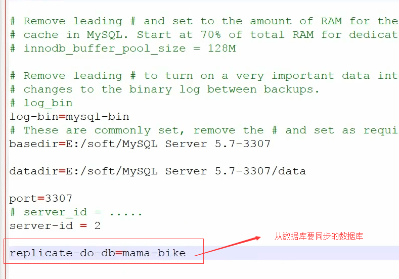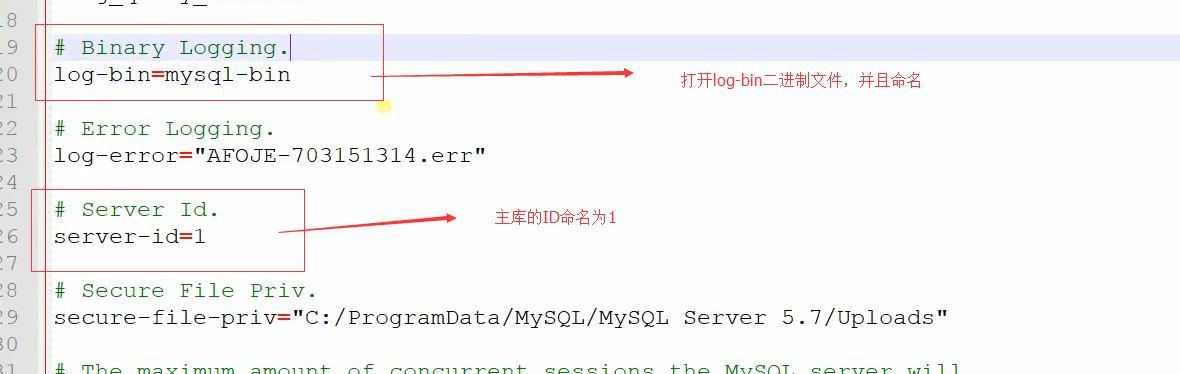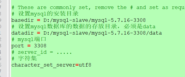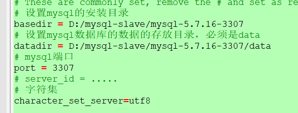 接着在回去 修改主库和从库中的my.ini文件,将主库ID命名为1,两个从库分别命名为2,3 配置如下: