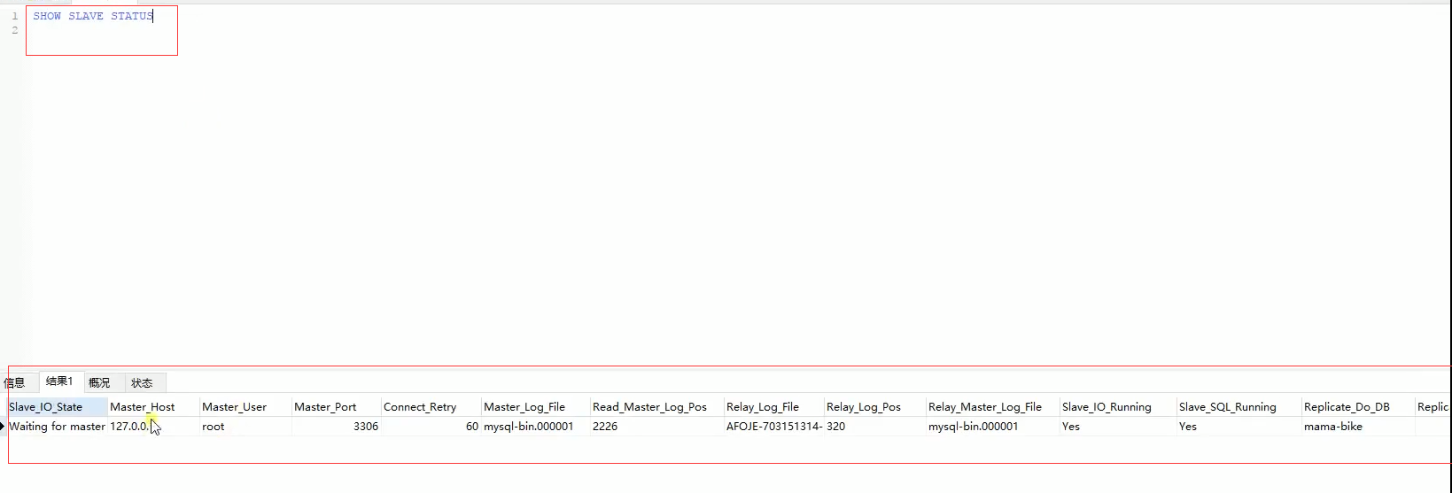 然后从数据库连接中再查询一下成功没有如下,如果出现如下信息即主从复制配置成功,如下: