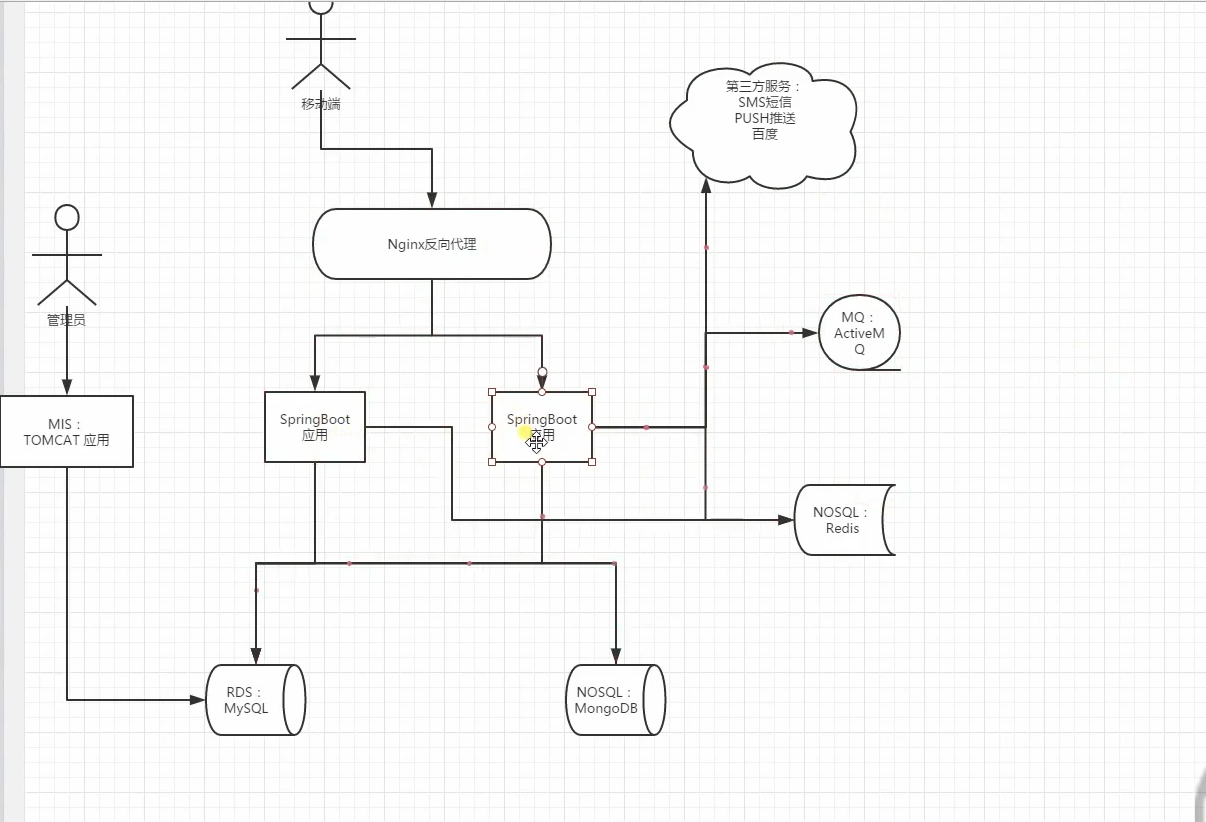 可以看到这个架构图的MYSQL如果随着业务量越来越大,I/O访问频率过高,单机是无法满足的。因此这时候就要进行MYSQL的主从复制,读写分离了,这样做分担了单个数据库的压力,数据备份,高可用和容错。
