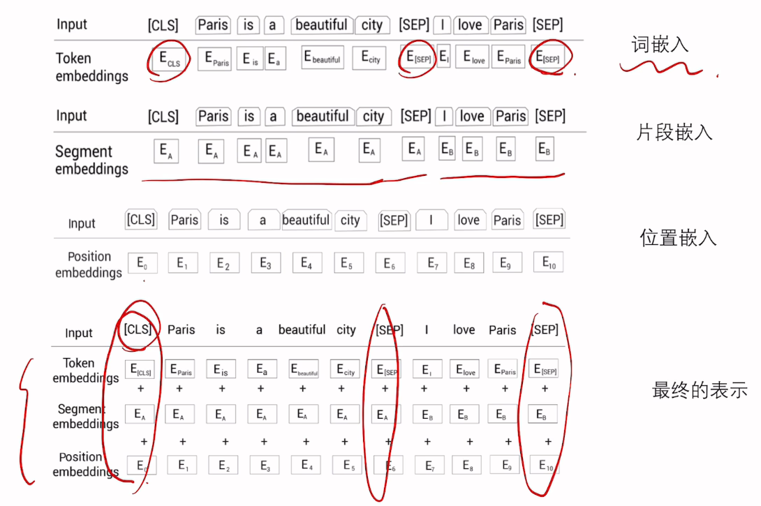 | 下方三种 embedding | 输入由三部分相加而成 |