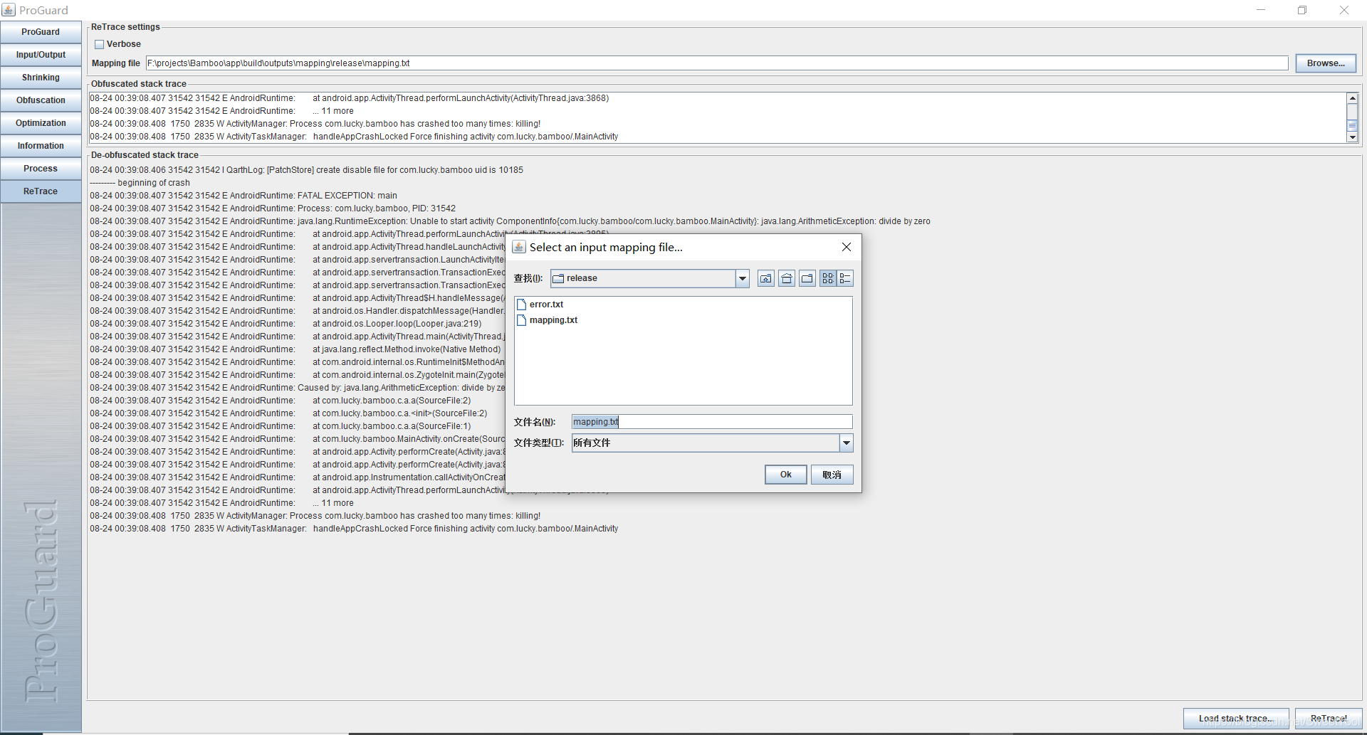 方法三、android sdk的tools下的proguard工具retraceui,不过感觉不好用,还不如命令行方便。