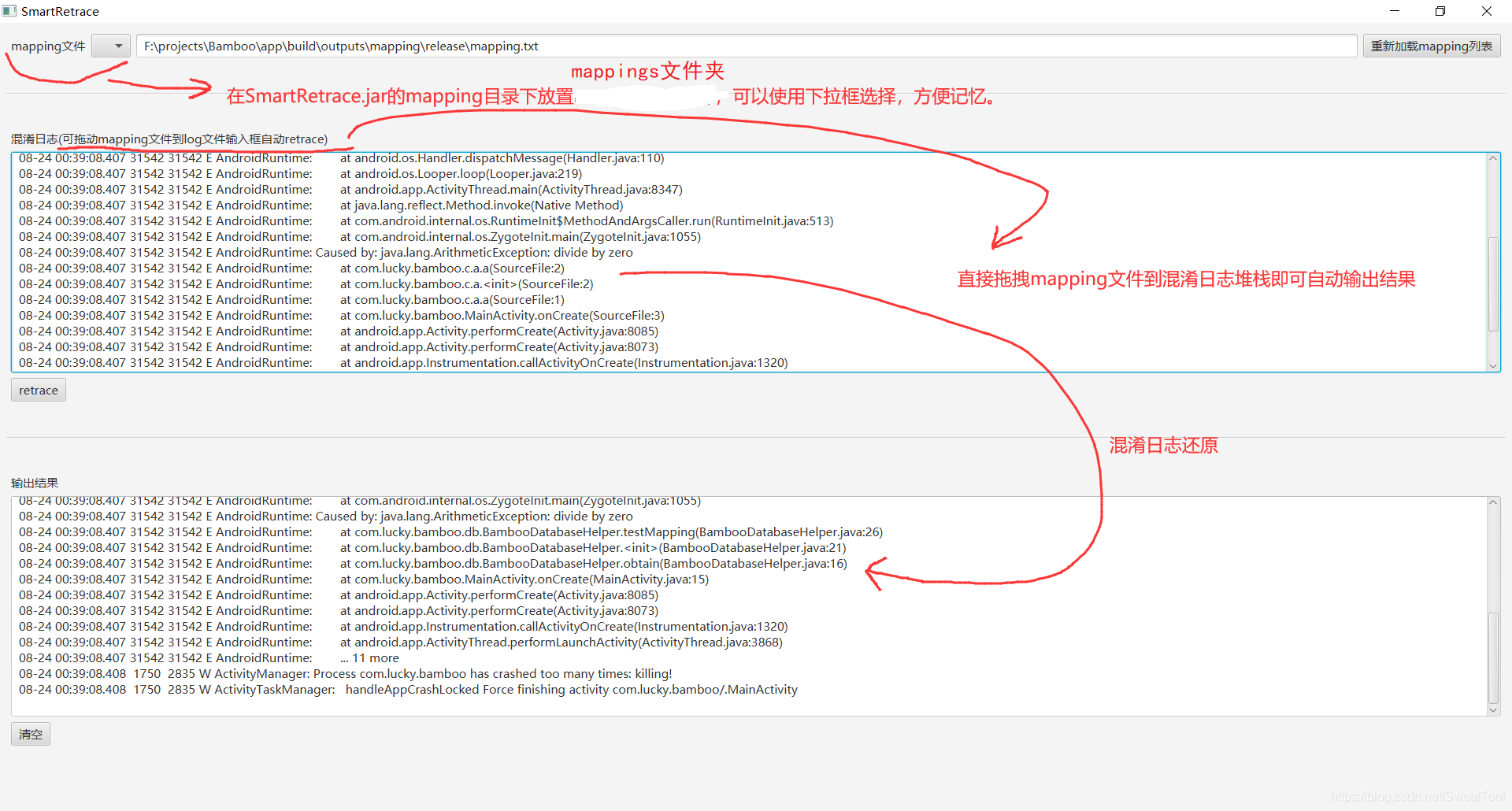 apk经过混淆后,在闪退时只要有mapping文件,可以通过retrace工具恢复。SDK提供的retrace命令如下: