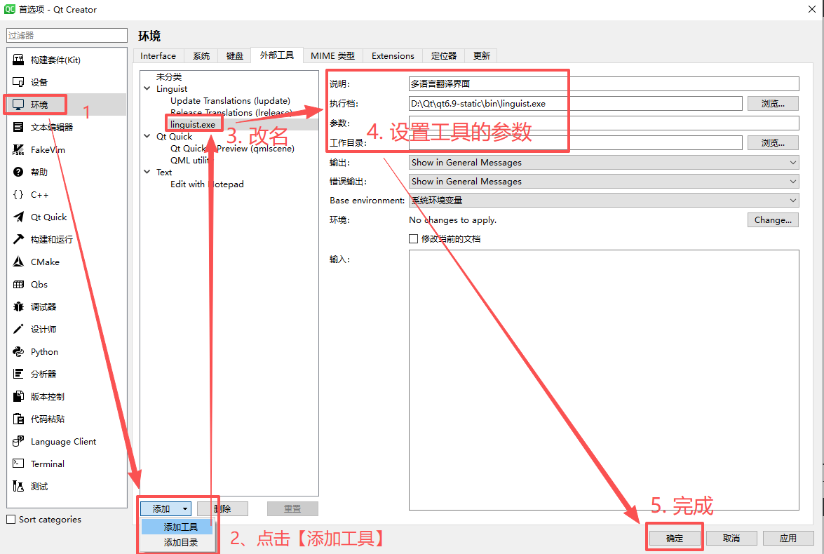 按下面图示,将 linguist 工具(语言专家)添加到菜单,方便后续使用: