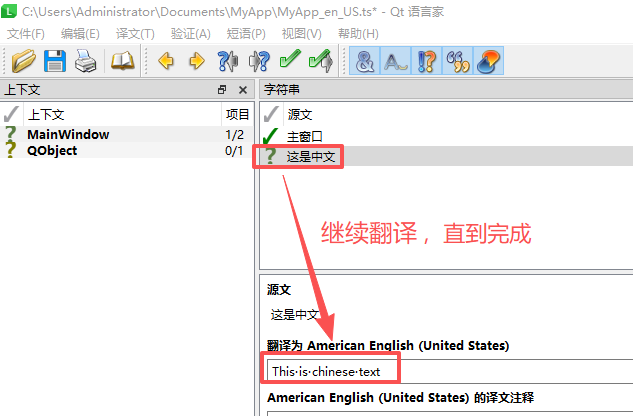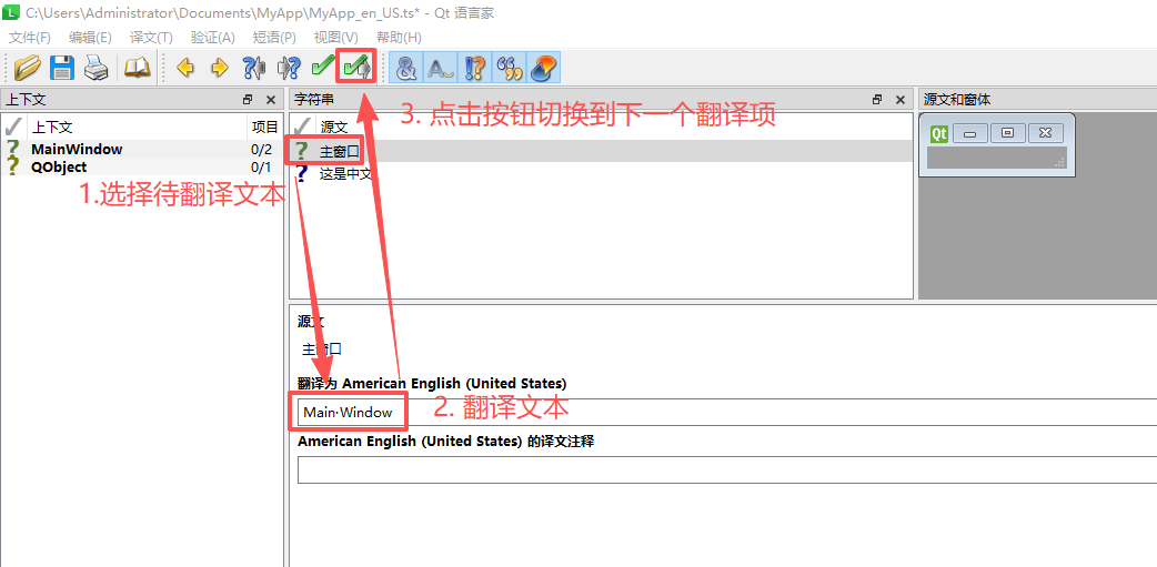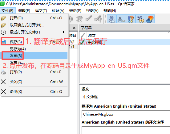 然后把编译生成的文件 MyApp_en_US.ts(在源代码目录下) 拖到工具界面,按下面的图提完成操作,将会生成翻译后的文件 MyApp_en_US.qm 。