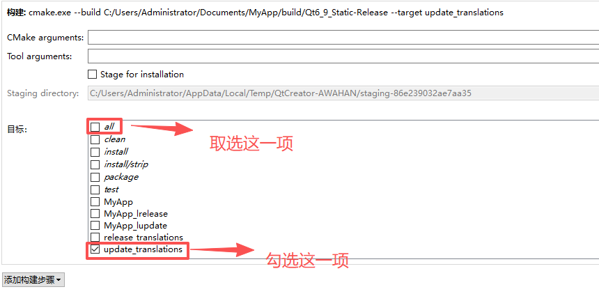 按下面两张图片的示意,添加新的编译命令 “update_translations”,该命令扫描源代码和UI设计文件中的界面文本,保存到文件 MyApp_en_US.ts 。代码编译成功之后,将会生成MyApp_en_US.ts文件,可用于后续的翻译。