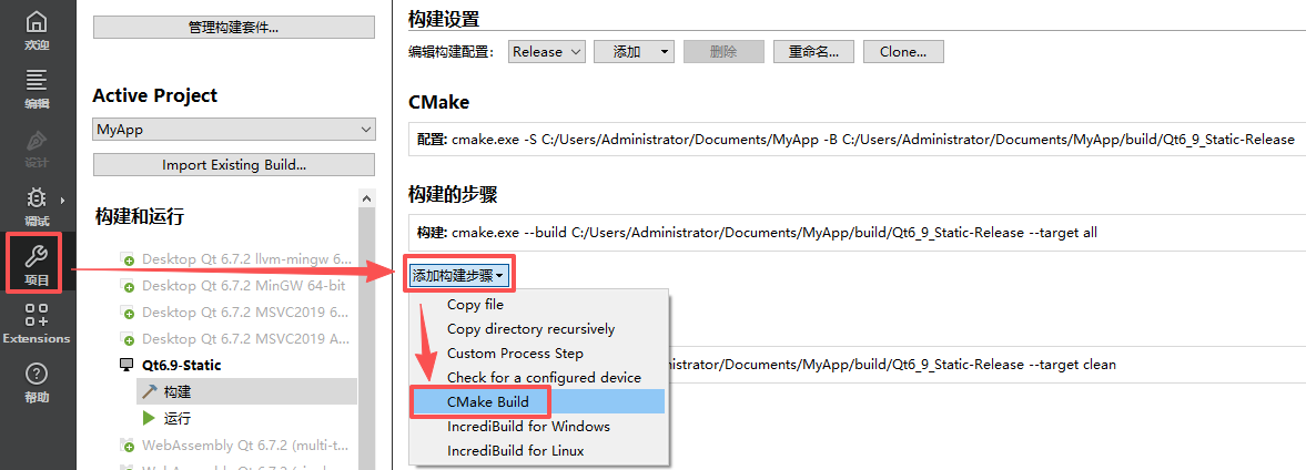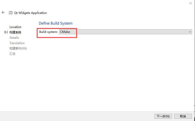 根据界面提示操作,在下图窗口中选择 CMake 编译工具(传统的pro项目是qmake):