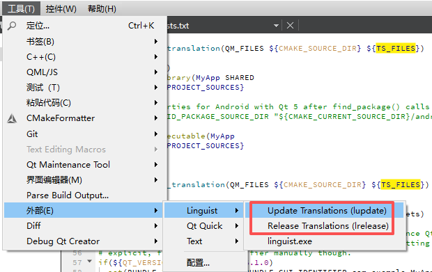 传统的Qt项目使用 xxx.pro 文件作为项目配置模版,无须额为设置就可以顺畅地使用Qt语言专家(linguist)处理UI界面的多语言问题。使用 CMake的项目配置模版(CMakeLists.txt),就需要额外设置才能方便使用Qt语言专家。