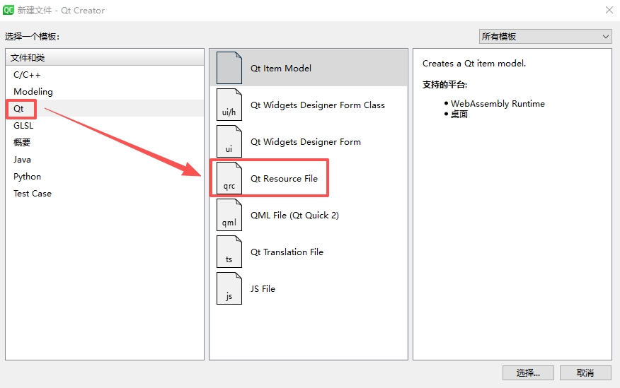 按下面图示,新建资源文件,然后把翻译后的二进制文件 MyApp_en_US.qm 导入资源文件: