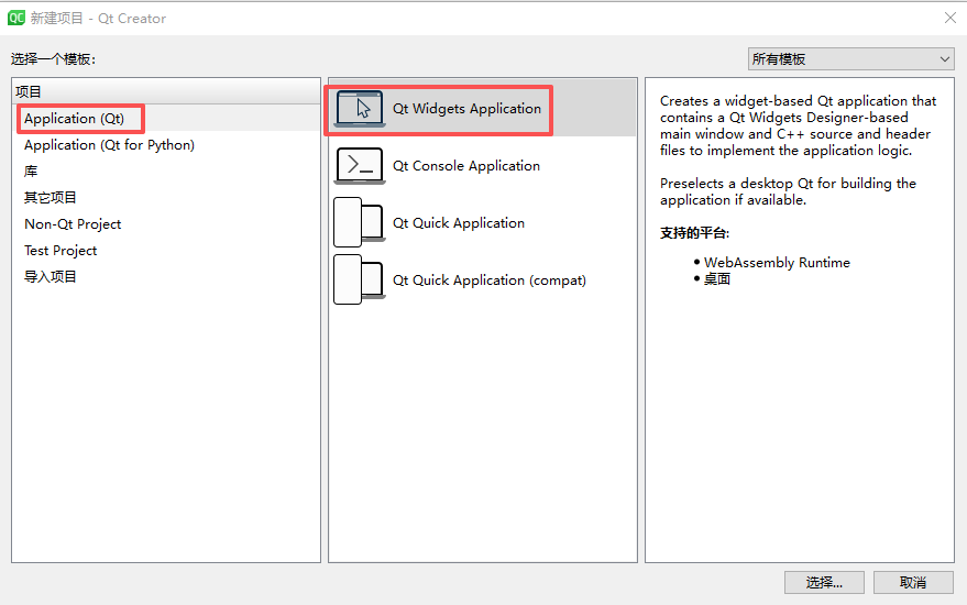 打开 Qt Creater, 点击菜单 文件 --> New Project ,弹出新建项目窗口,然后选择 [Qt Widgets Application] 模版,如下图: