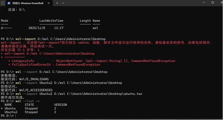 使用这个命令wsl--import,然后给它起个名字,这里我叫乌邦图2,后面是我刚才新建的那个文件夹D盘的WSL目录,在后面是我的压缩包的路径,然后回车这里显示导入成功
