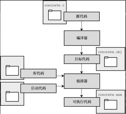 目标代码还缺少库函数。几乎所有的C程序都要使用C标准库中的函数。例如,concrete.c 中就使用了printf() 函数。目标代码文件并不包含该函数的代码,它只包含了使用printf() 函数的指令。printf()函数真正的代码储存在另一个被称为库 的文件中。库文件中有许多函数的目标代码。