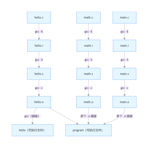 多文件编译链(main、math 系列):main.c 和 math.c 各自经历预处理、编译、汇编过程,生成 main.o 和 math.o,再将这些目标文件与 hello.o 一起链接,最终生成可执行文件 program。