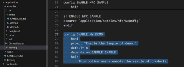 在menuconfig中显示配置选项,depends on SAMPLE_ ENABLE确保先启用sample示例,default n 默认不启用,用户需要手动选择生成 CONFIG_MY_DEMO 宏供CMake使用