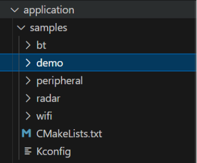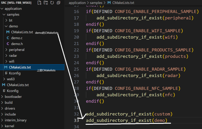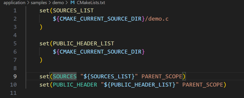 使用CMake编译需要在各个文件层级创建CMakeLists.txt 文件,以便于创建链接。因此首先在 application/samples/demo/CMkakeLists.txt 文件中为组件模板添加源码文件以及源码头文件路径: