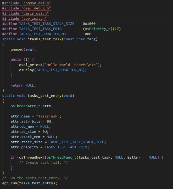 在demo.c、demo.h中添加自己的业务代码,这里以在demo.c中添加一个创建任务,并在任务中打印消息为例,app_run函数为应用程序的入口函数。