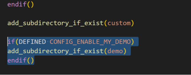 另外也可通过例如CONFIG_ENABLE_MY_SAMPLE宏控制是否编译demo代码。例如以下代码,告诉CMake系统在什么条件(定义CONFIG_ENABLE_MY_DEMO)下编译hello_world目录,CONFIG_ENABLE_MY_DEMO 是Kconfig生成的宏,add_subdirectory_if_exist 确保demo目录存在时才添加