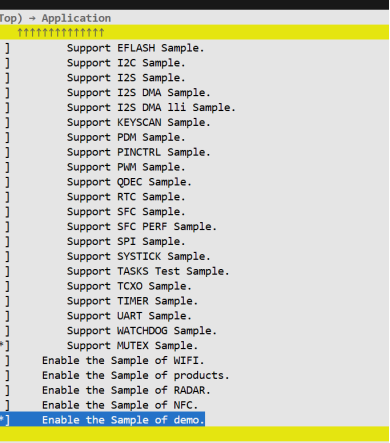 在/fbb_ws63/src# 中输入./build.py menuconfig ws63-liteos-app,打开配置界面,选中 Enable the Sample of demo并保存即可编译demo工程