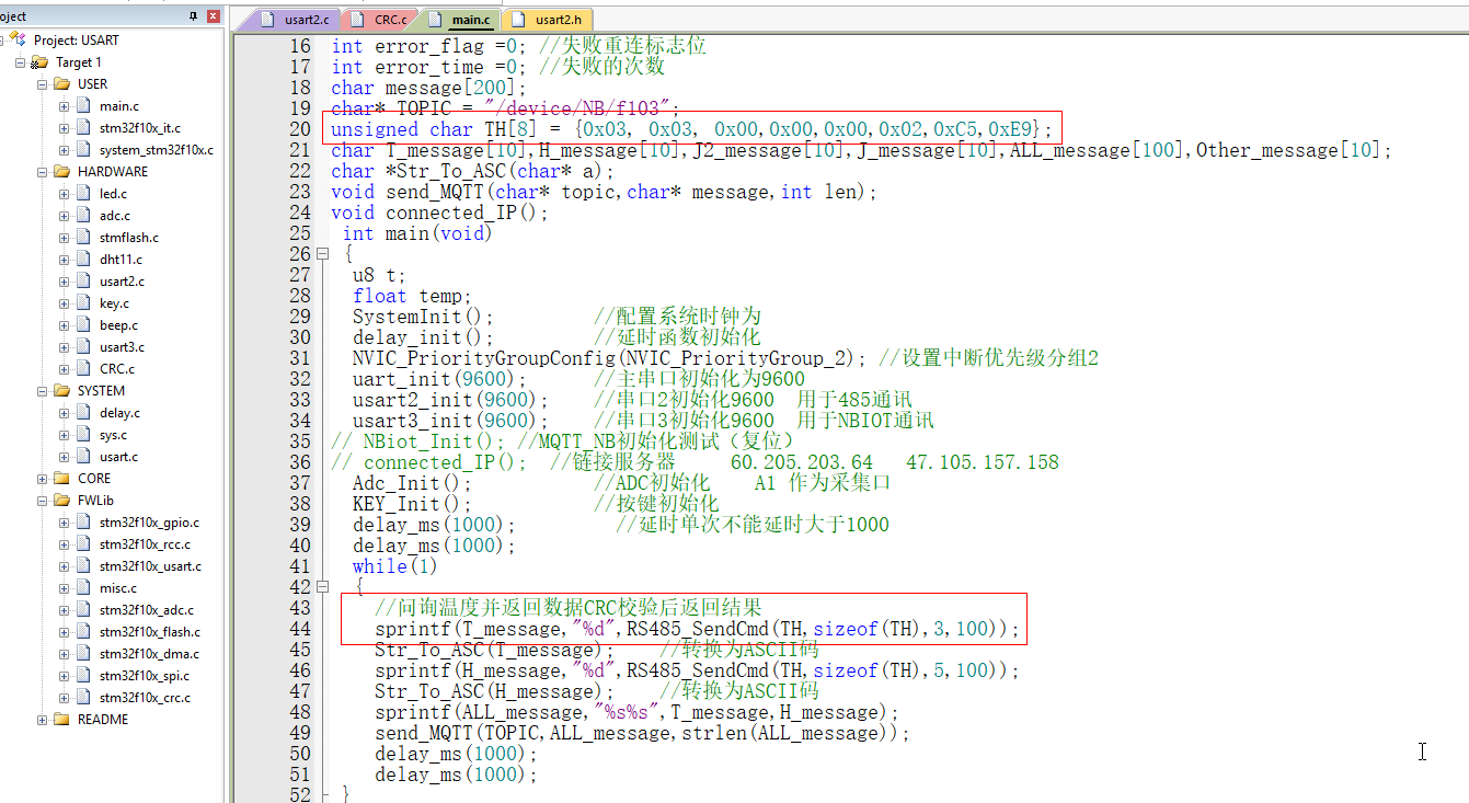 原理分析:在设备串口问询485数据后,会立即进入接收串口接收中断,同时将接收的数据存入结构体,然后进行返回值除去后两位的CRC校验判断是否与返回的数据相等,如果满足CRC校验,就确认为正常数据。接下来可用于NB的发送。