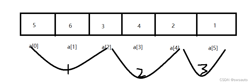 下图是有6个数,第一轮比较中找到的最小值,最终1放到了a[0]的位置,