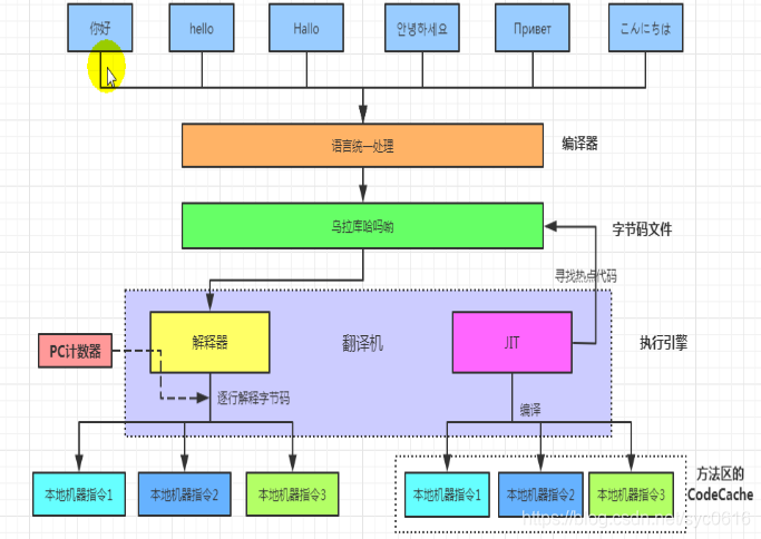若想JAVA程序运行,执行引擎的任务就是将字节码指令解释/编译为对应平台上的本地机器指令才可以。即执行引擎充当了高级语言翻译为机器语言的翻译者。