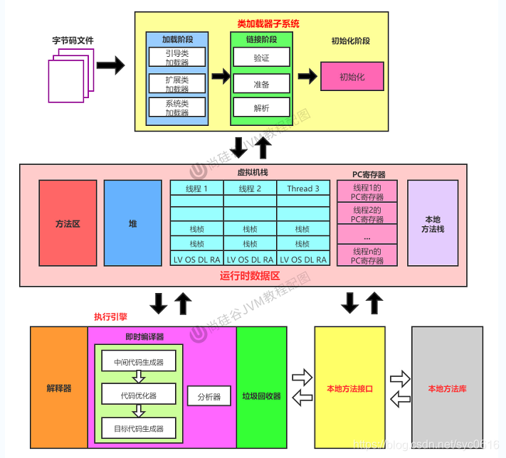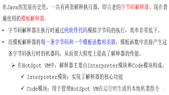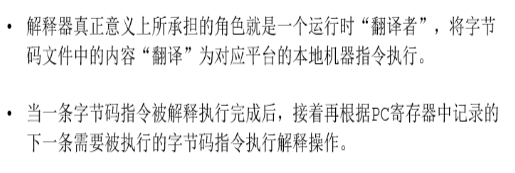对应图1的绿色部分;当JVM启动时会根据预定义的规范对字节码采用逐行解释的方式执行,将每条字节码文件中的内容翻译为对应平台的本地机器指令执行。