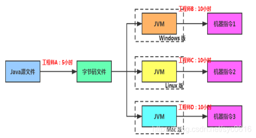 对应图1的蓝色部分;JVM将源代码直接编译成和本地机器平台相关的机器语言。
