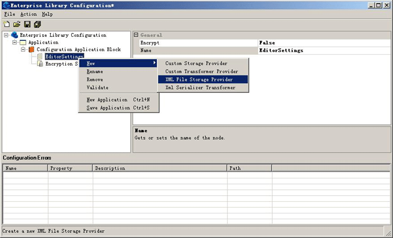 3.右击 Configuration Application Block 并选择 New | Configuration Section,创建一个配置区,注意对于每一个配置区都要设置一个Storage Provider 和一个Transformer。