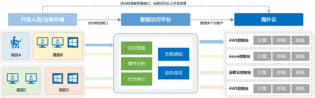 某些企业在使用多个云商资源时,面临多云后台的管理、业务、研发、测试被多部门频繁访问,但通过公网访问及多部门混合使用,会带来隐患及管理挑战。
