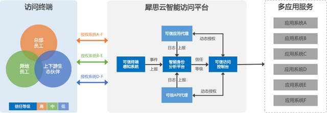 在访问安全上,摆脱以往的VPN模式,智能访问采取零信任机制,基于访问应用系统、终端、身份、网络等类型,进行细科粒、多维度的风险度量,进行持续动态验证;设置无公开访问入口,应用访问隐藏,最大程度减少被攻击的可能;并从访问终端至应用服务之间全程端到端加密保护来实现有效的访问安全保障。