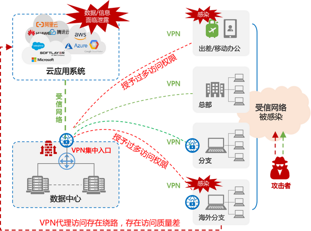 同时无论是向外访问的公用应用,还是自家公司私有应用,多数情况下VPN访问模式居多。然而当一个受信VPN网络下的主机,携带了病毒后访问系统,则数据将面临着泄露。如果企业总分支职场的各级员工、不同部门、外部伙伴同时在使用这个系统时,访问安全将面临更大挑战。